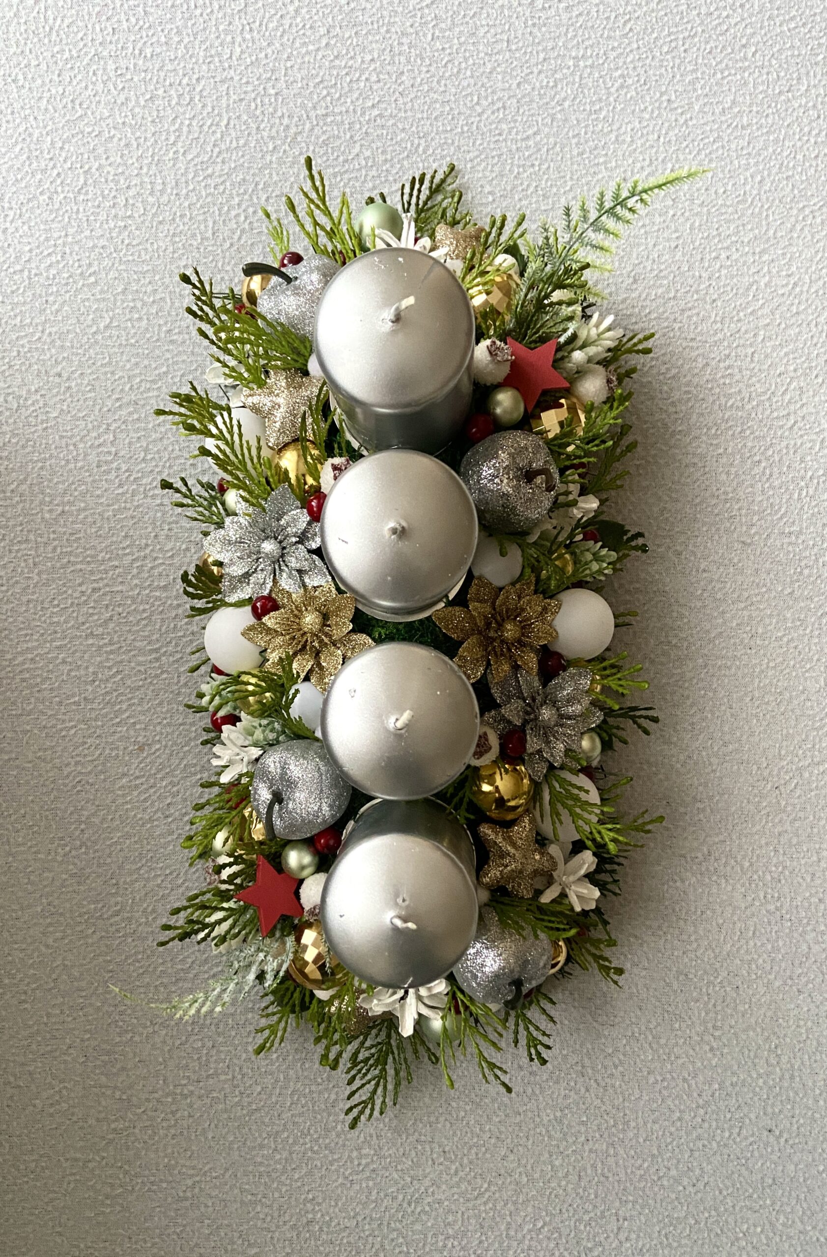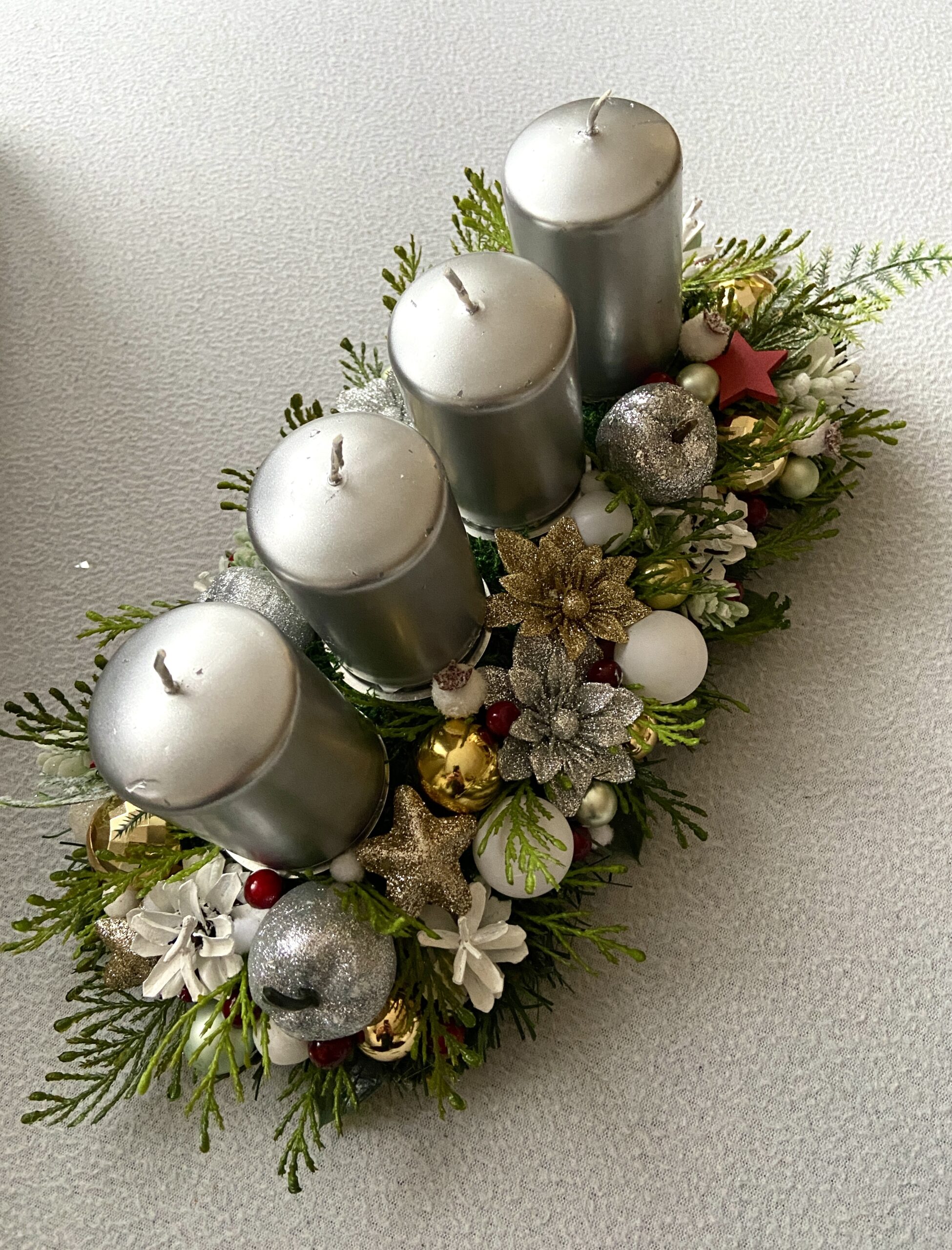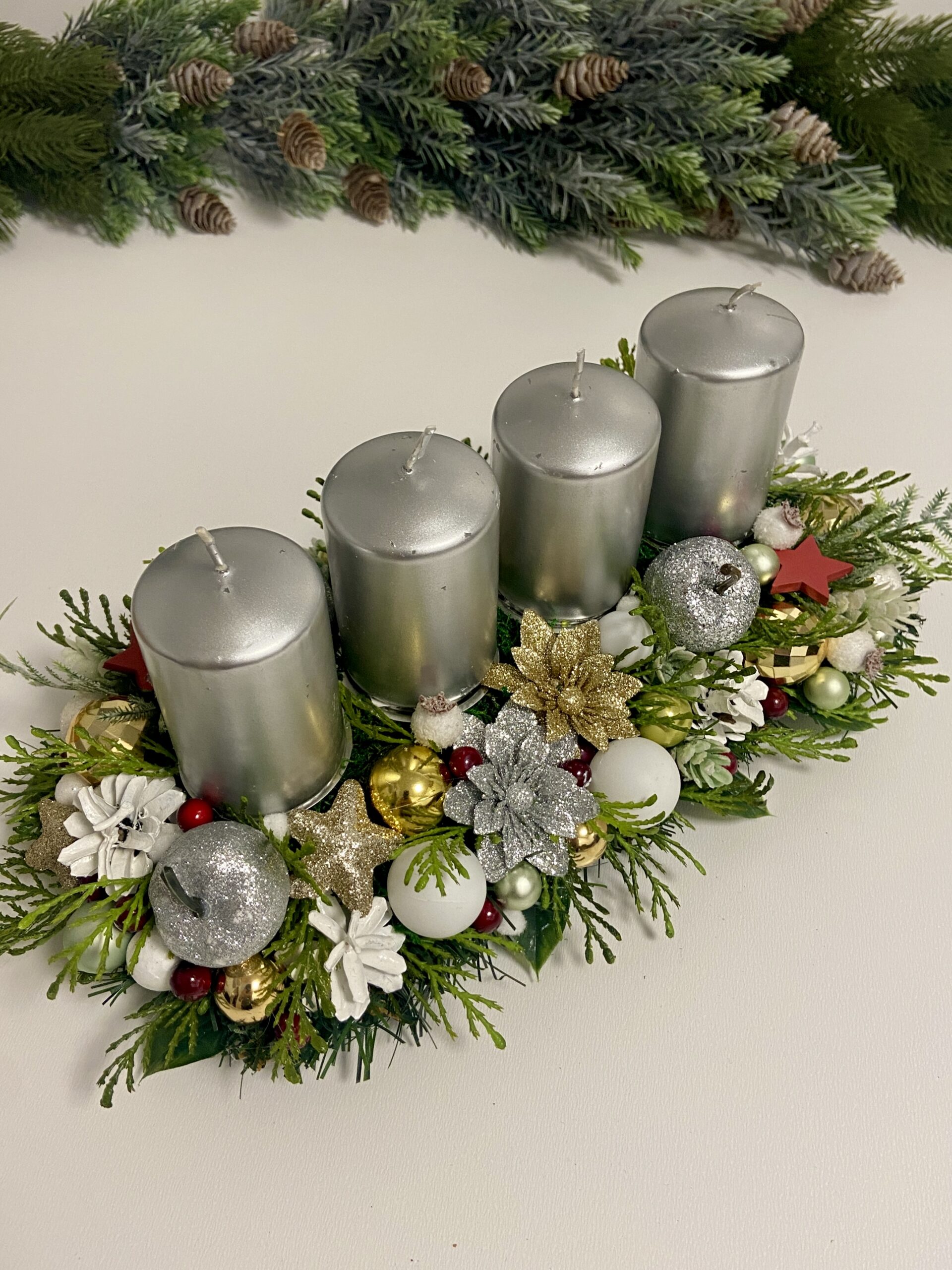 Bohato zdobený adventný svietnik na podlhovastej sklenenej podložke. Sviečky sa dajú jednoducho vymieňať, sú napichnuté na bodci s ihlou.