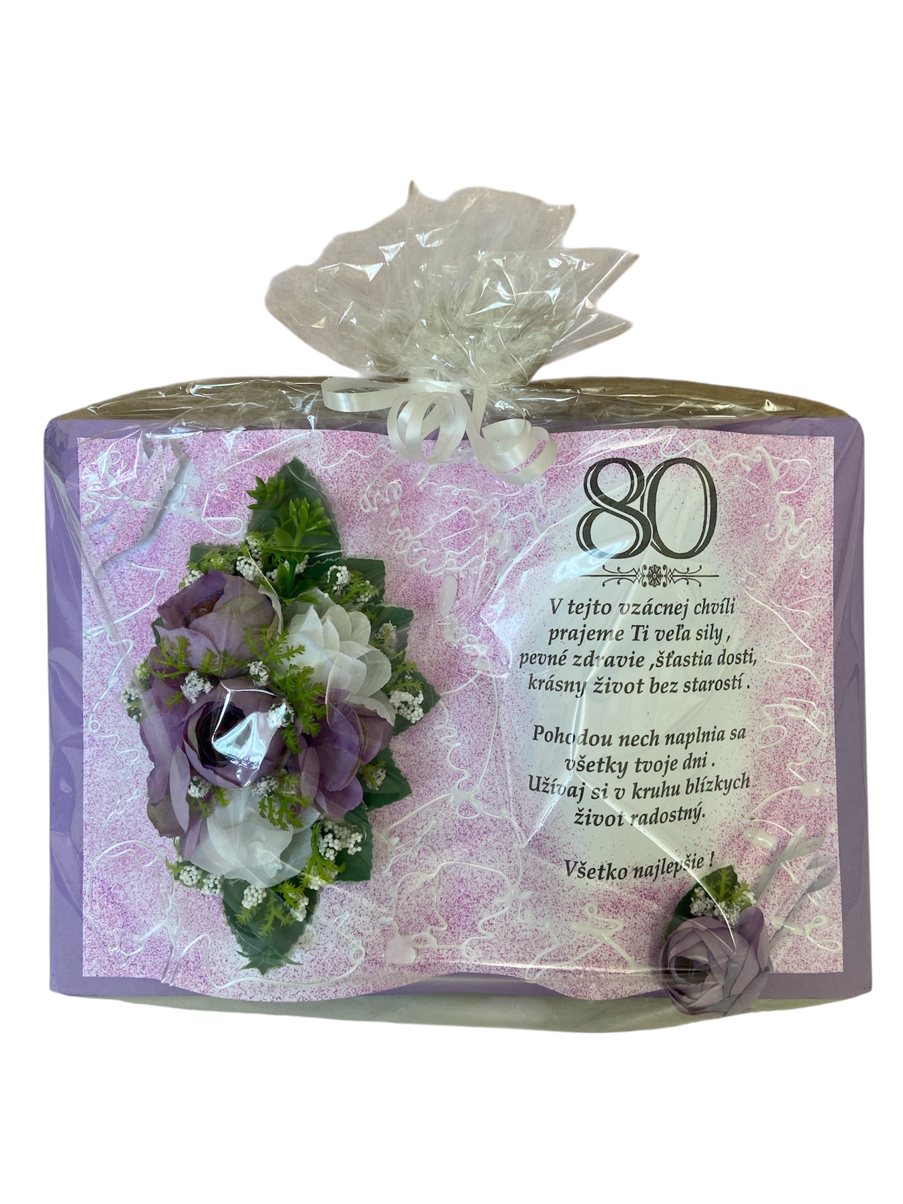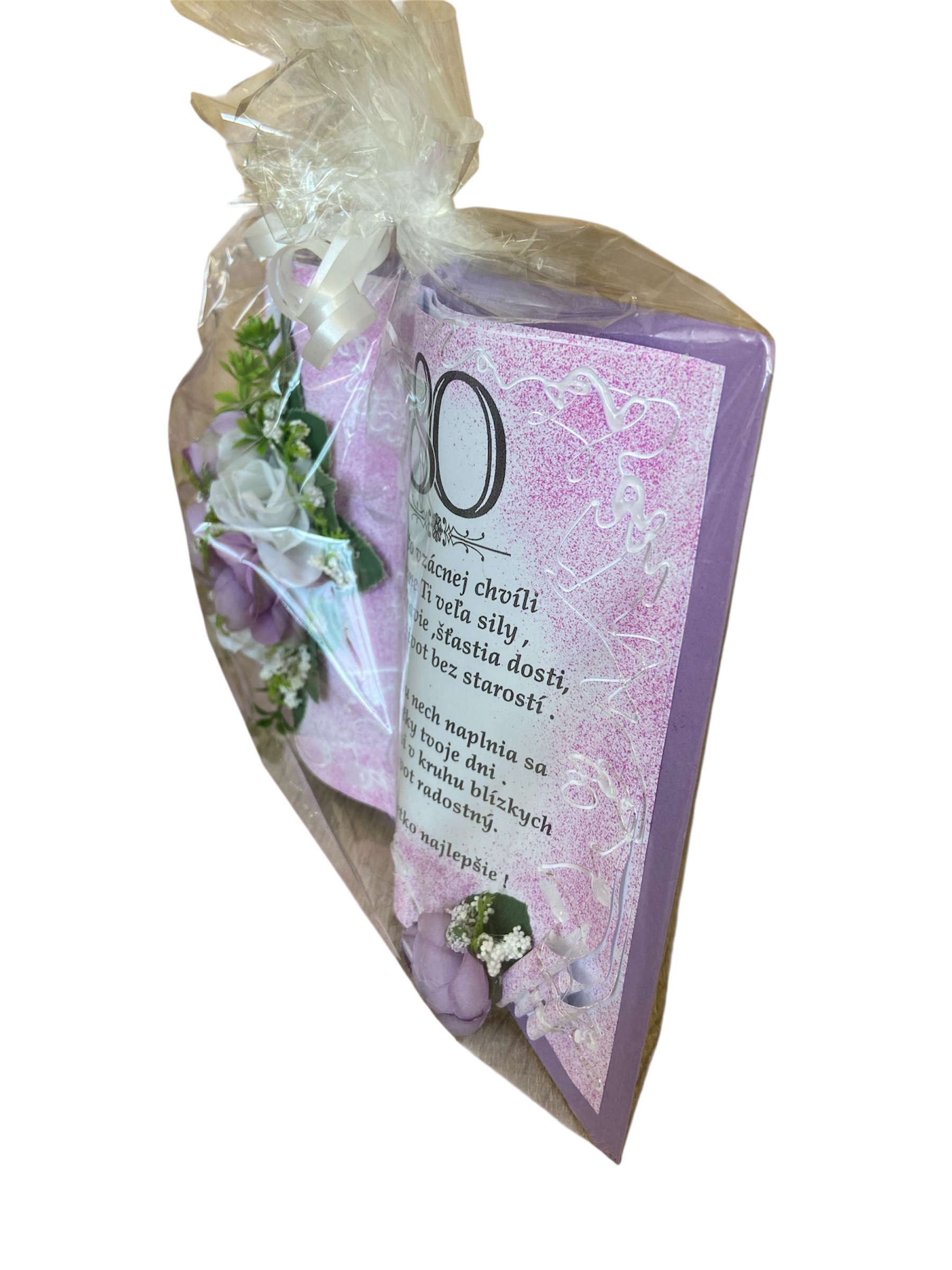 Blahoželanie k výročiu vo forme otvorenej knihy, zabalené v celofáne, pripravené na darovanie. Každé blahoželanie je ručne vyrobený originál, preto sa môže kvetinový dekor mierne líšiť od fotky.