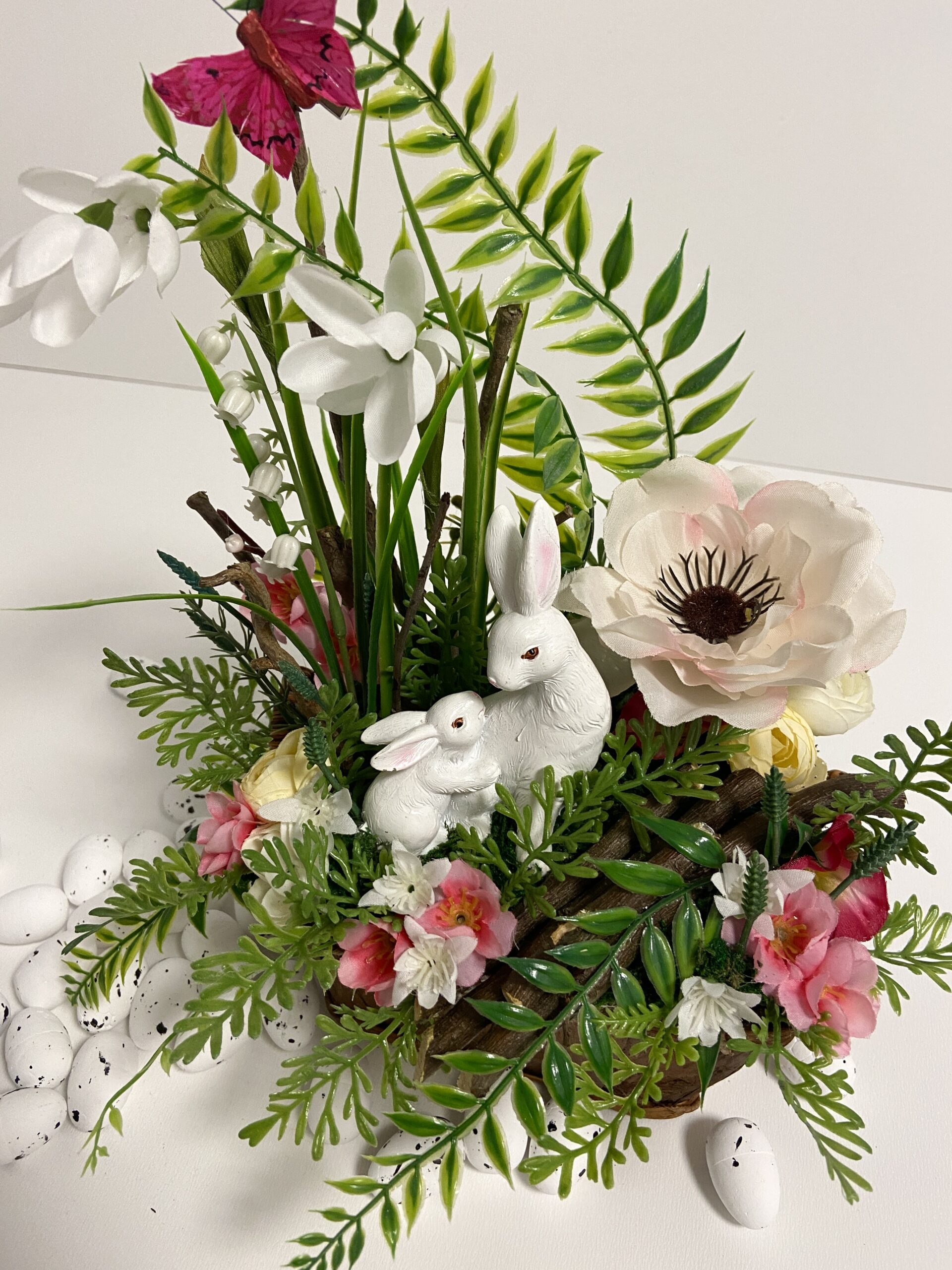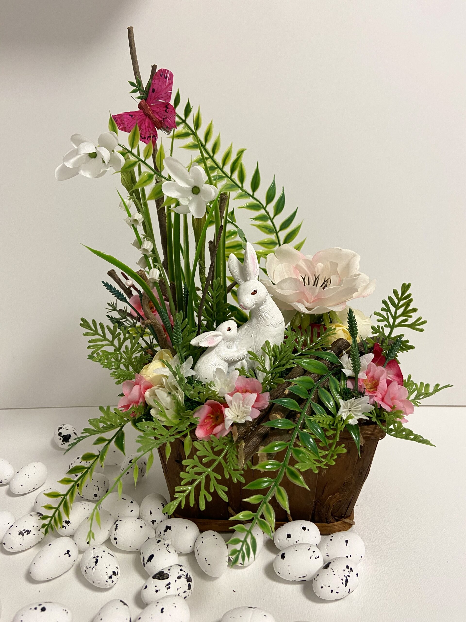 Jarná, veľkonočná dekorácia v prútenom „truhlíku“, so zajačikmi, vhodná na stôl, komodu, poličku či parapetnú dosku…